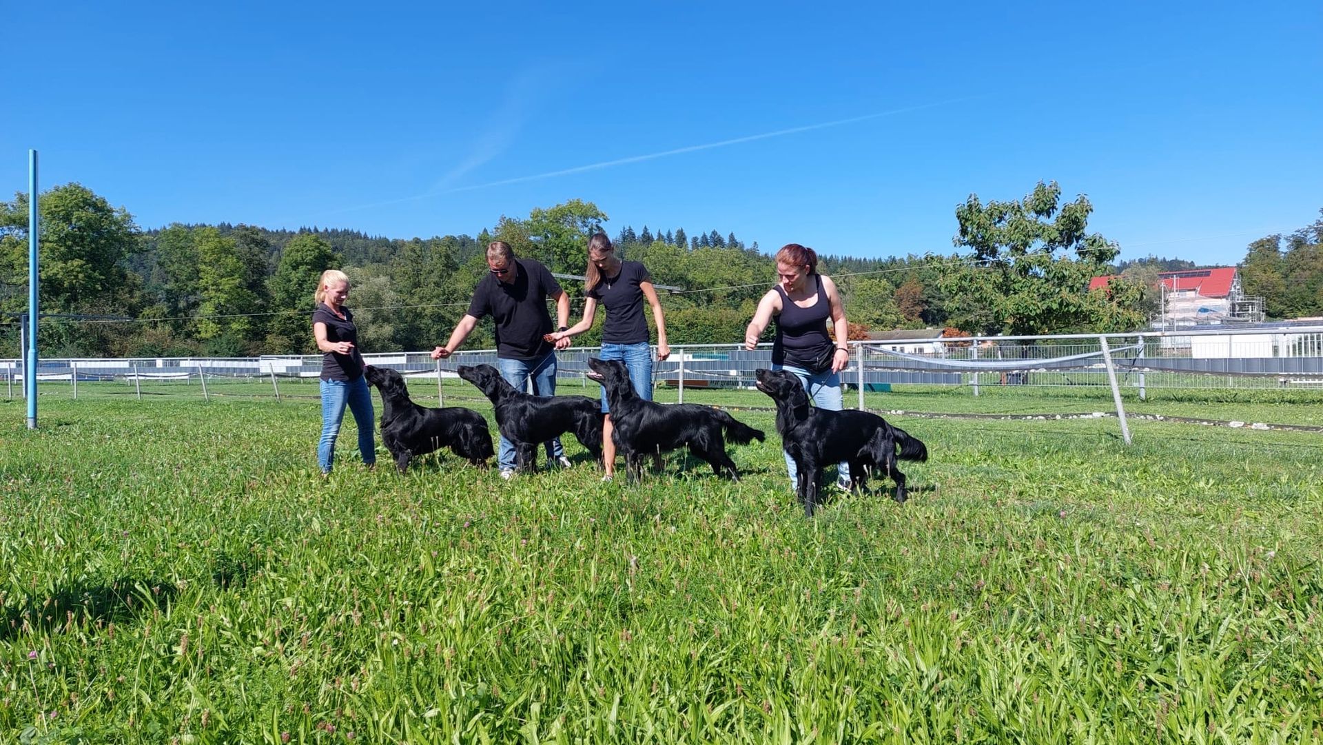 Beim Üben hatten wir einen Riesenspaß, die Fotos im Beige-Limegrünen Einheitslook mit vier der schönsten schwarzen Hunde der 3./4. SRA Marpingen Urexweiler (JBOB, BOB und BOS) sind ein Hingucker, s. Facebook Beautyfields Flat Coated Retriever, und wir gewannen auch noch an beiden Tagen den Zuchtgruppen-Wettbewerb.