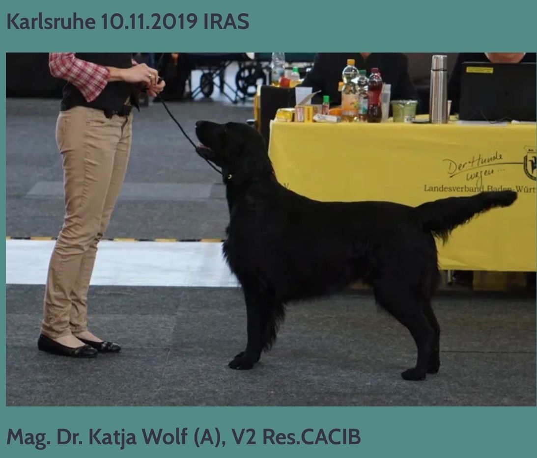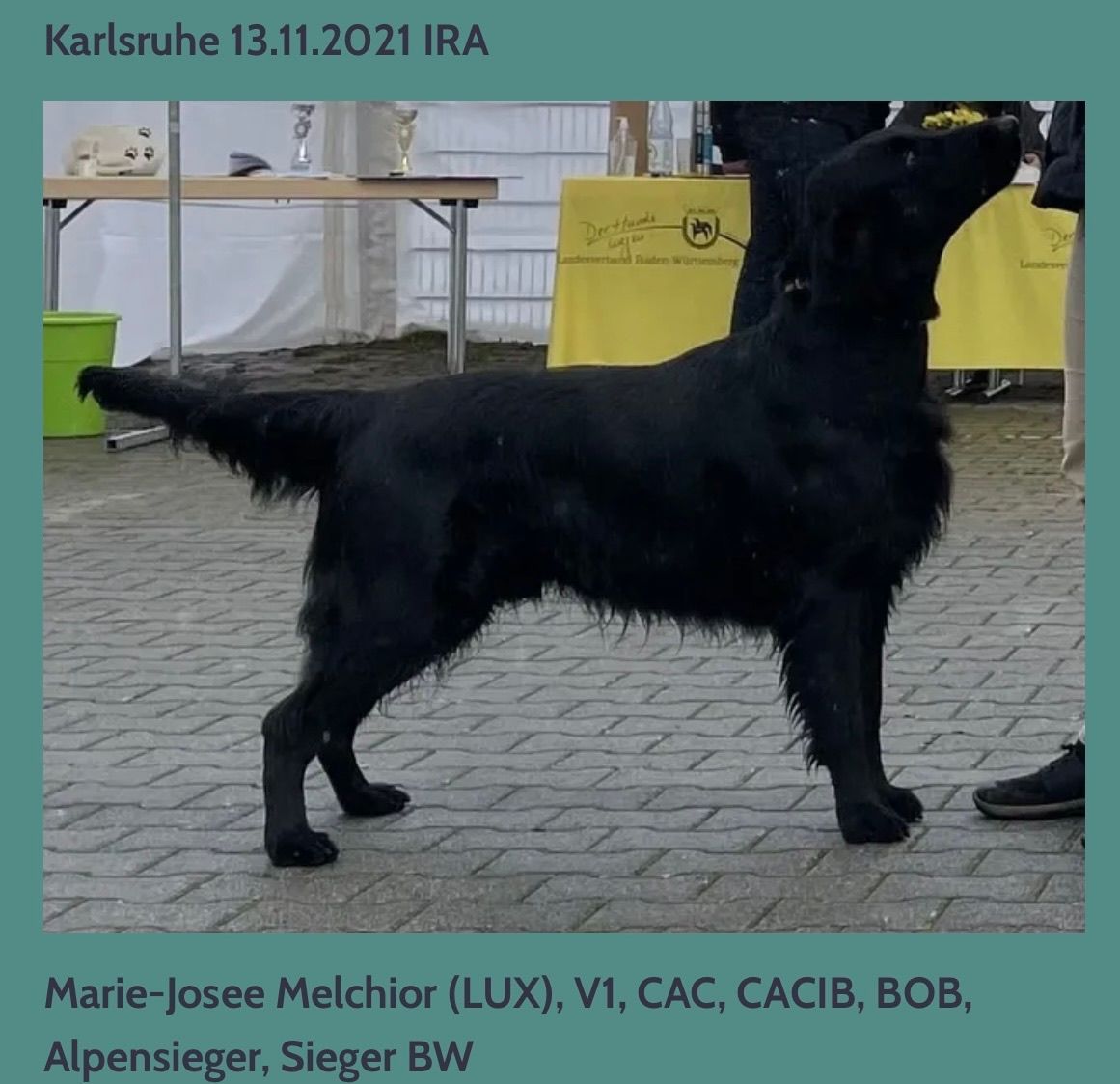 Er setzt sich gegen 31 Flat Coated Retriever als bester seiner Rasse (Best of Breed, BOB) durch und wird Sieger Baden-Württemberg und Alpensieger (VDH).